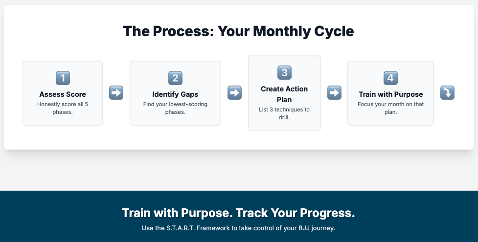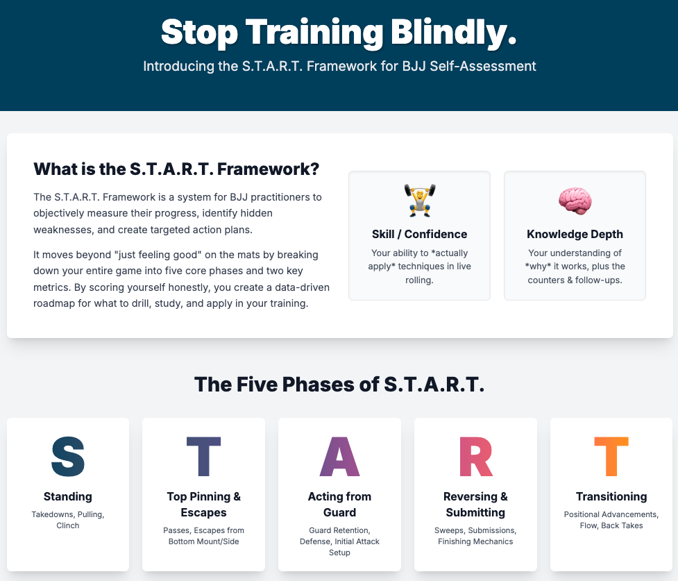 The S.T.A.R.T. Framework is a focused, five-phase system designed to help Brazilian Jiu-Jitsu practitioners objectively assess and systematically improve their skills across the entire engagement sequence.